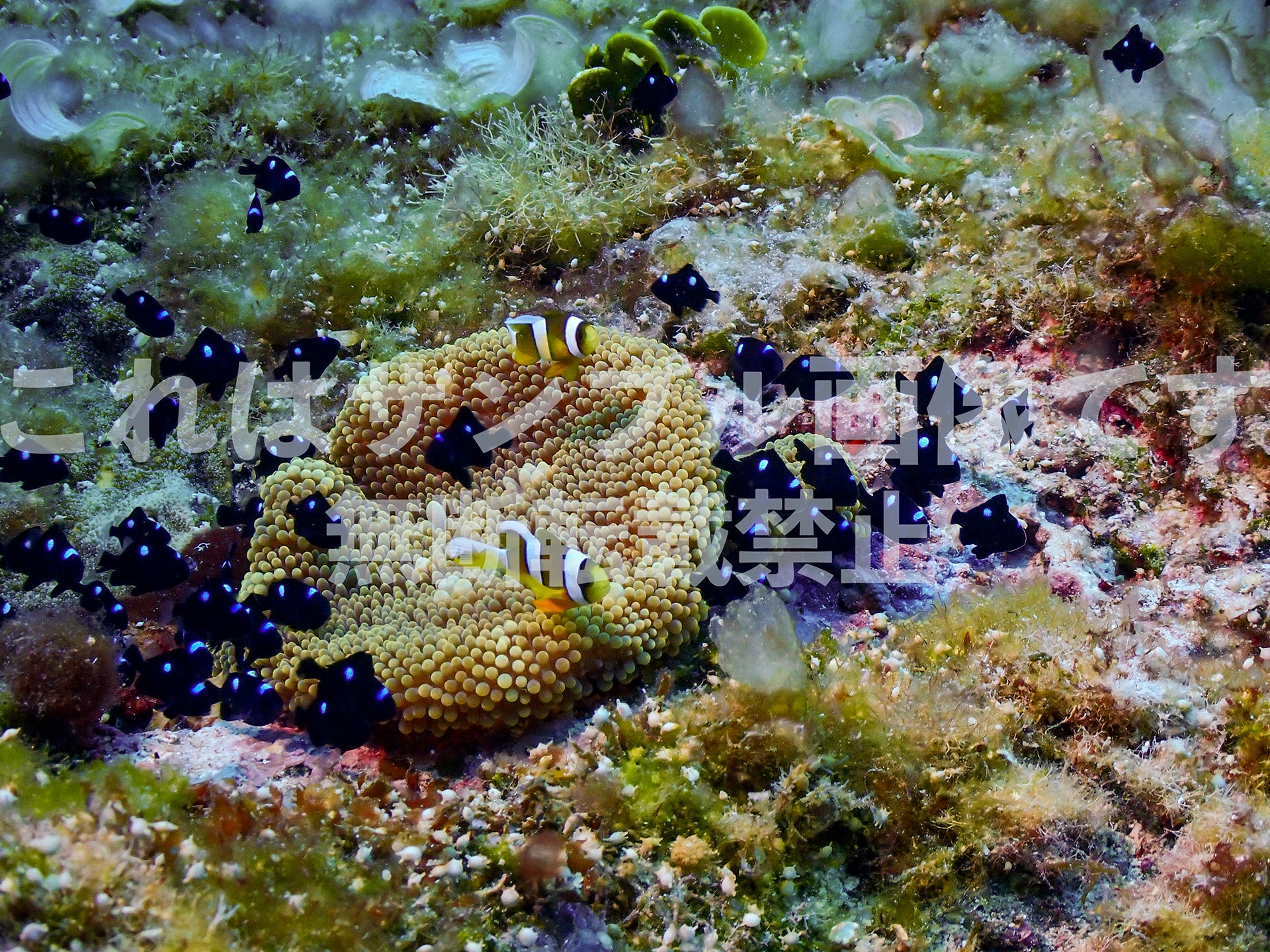 クマノミとクロイシダイたちがイゾギンチャクの周りで戯れている写真です。環境教育の資料、アクアリウムショップのPR、熱帯の海の雰囲気を伝えるWebバナーに最適です。