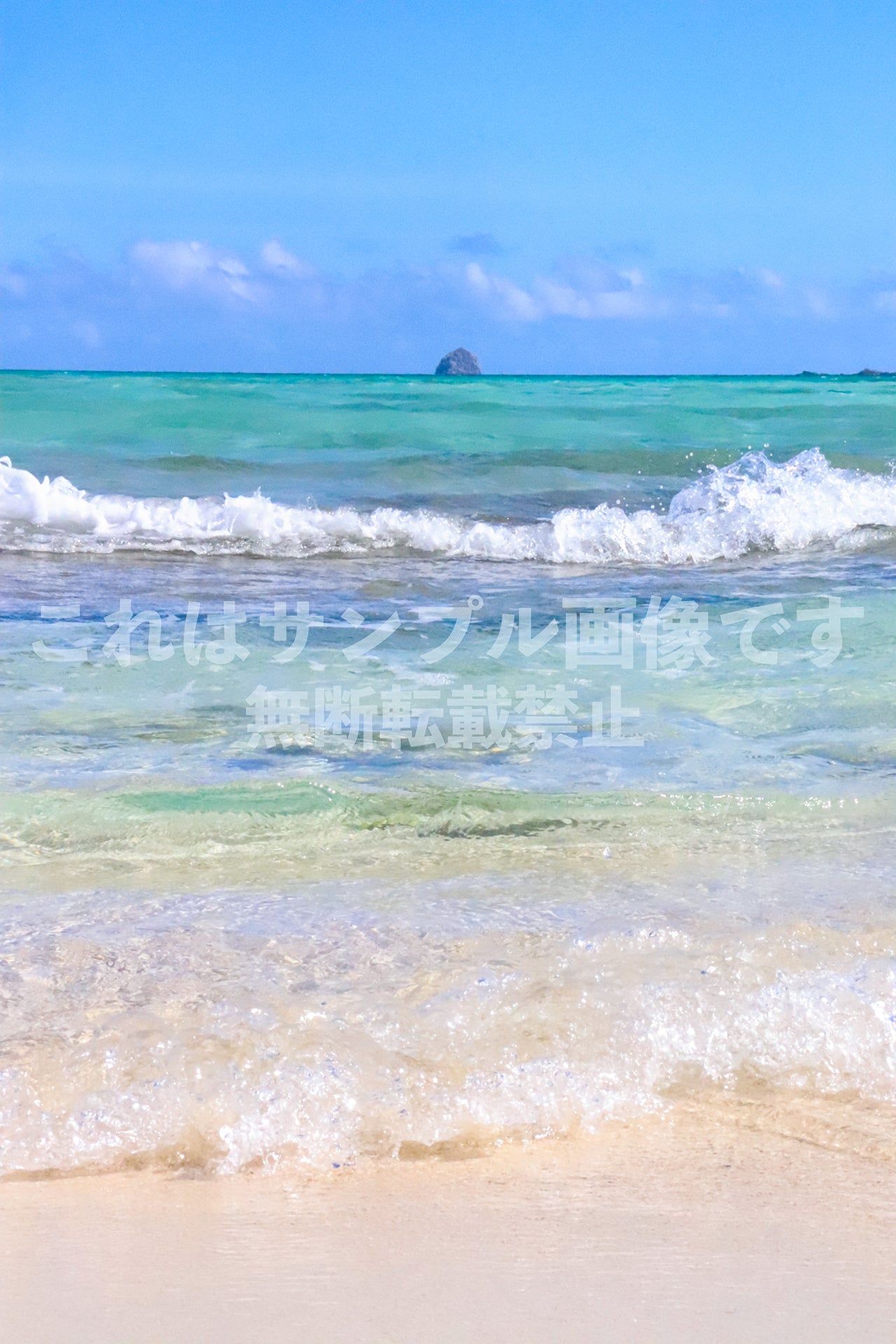 透明度の高い海水が砂浜に打ち寄せる瞬間を切り取った、波のクローズアップ写真です。清涼感や純粋さをアピールしたい化粧品や飲料の広告の背景、リラクゼーション、暑中見舞いの素材などに適しています。