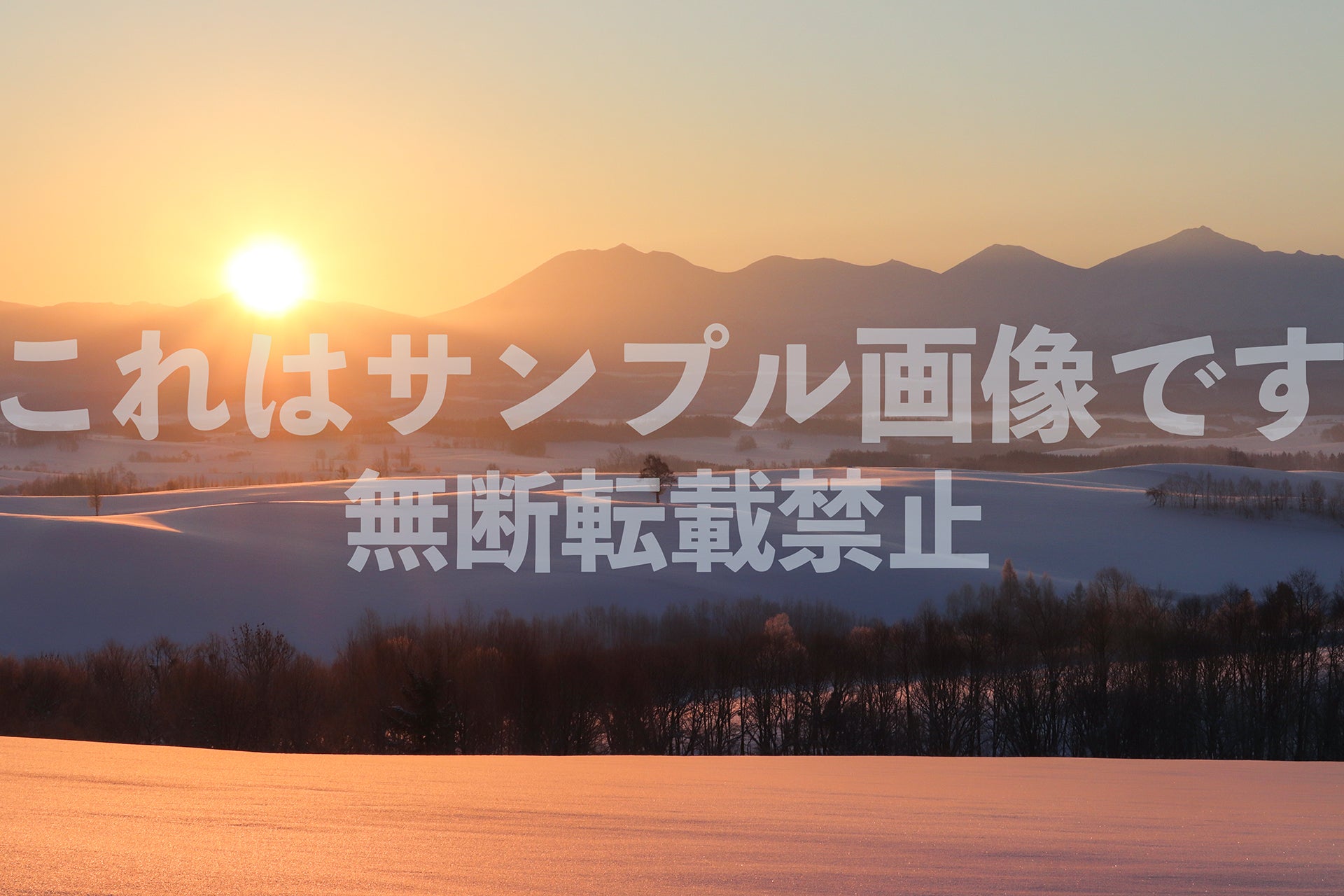 山際から昇る太陽が雪原を黄金色に照らす瞬間です。ダイヤモンドダストを撮影するのが目的でしたが、見ることが叶わず。-20℃の日に撮影した一枚です。10分が限界でした。新年の挨拶、希望やエネルギーを表現するビジュアル、インパクトのある冬の素材におすすめです。