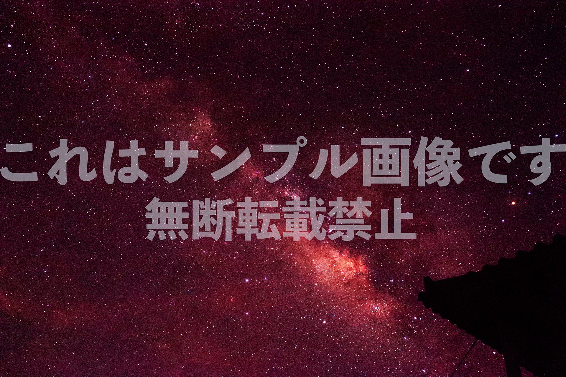 赤みを帯びた色合いで強調された天の川と、屋根のシルエットの写真です。ドラマチックな夜空の表現や、印象的なデザインの素材としておすすめです。