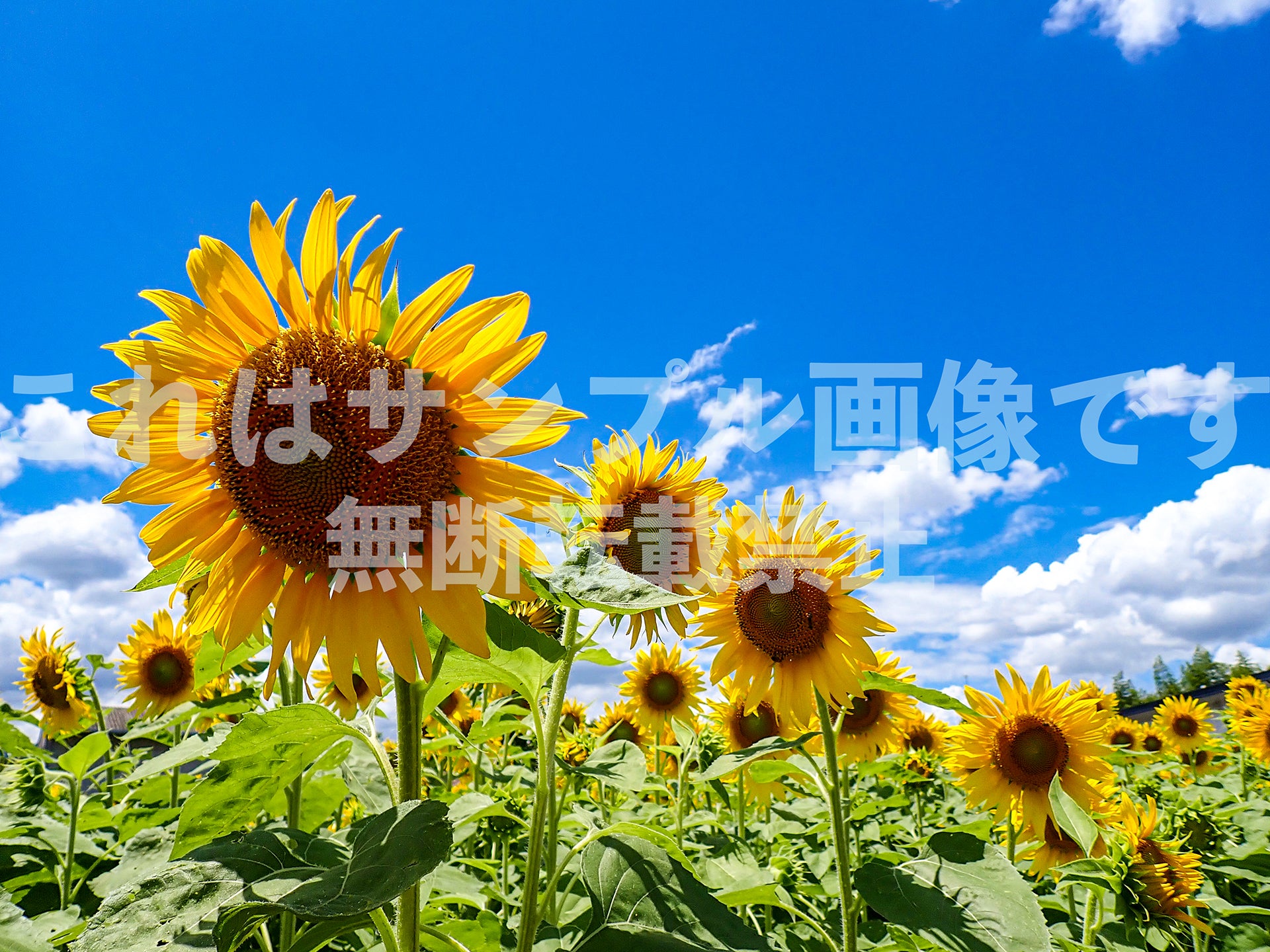 青空の下で、大輪のヒマワリが太陽に向かって力強く咲く夏の風景です。夏休みのキャンペーンポスターや、元気で明るい印象を与えたい広告デザインに適しています。