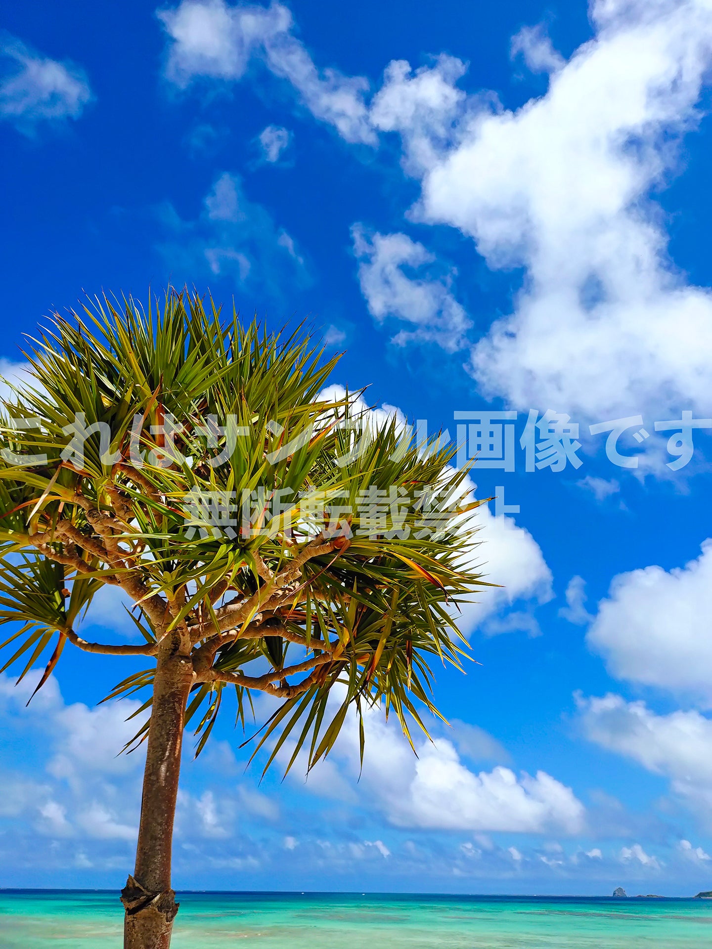 澄み切った青空と白い雲を背景に南国の木が立っています。南の島の暖かな気候を伝えるパンフレットや、明るい印象のWebサイトの素材におすすめです。